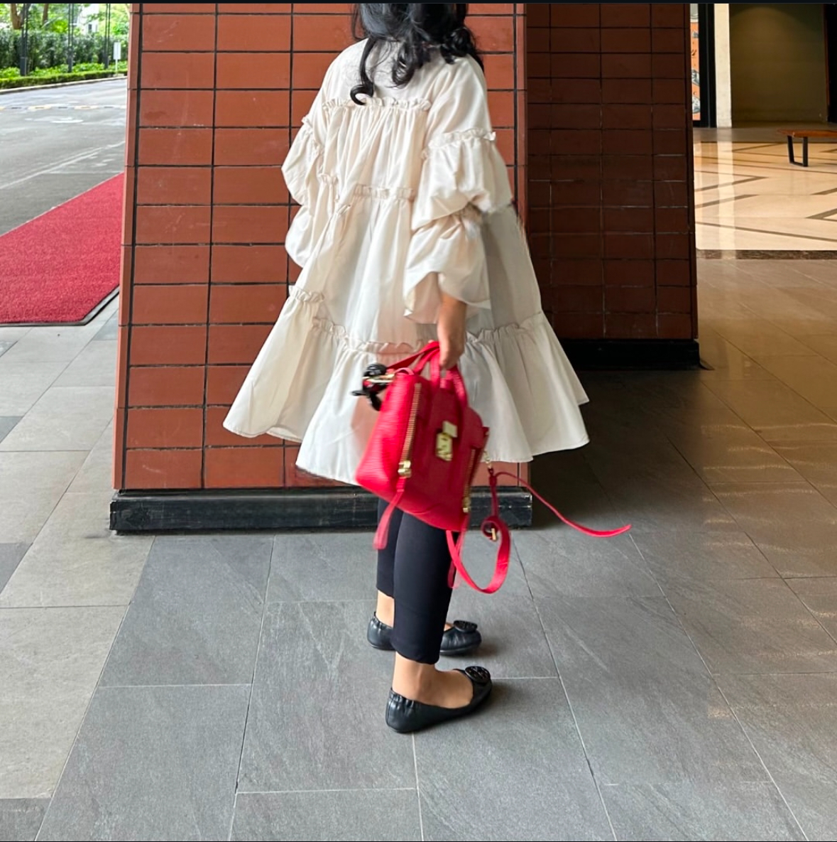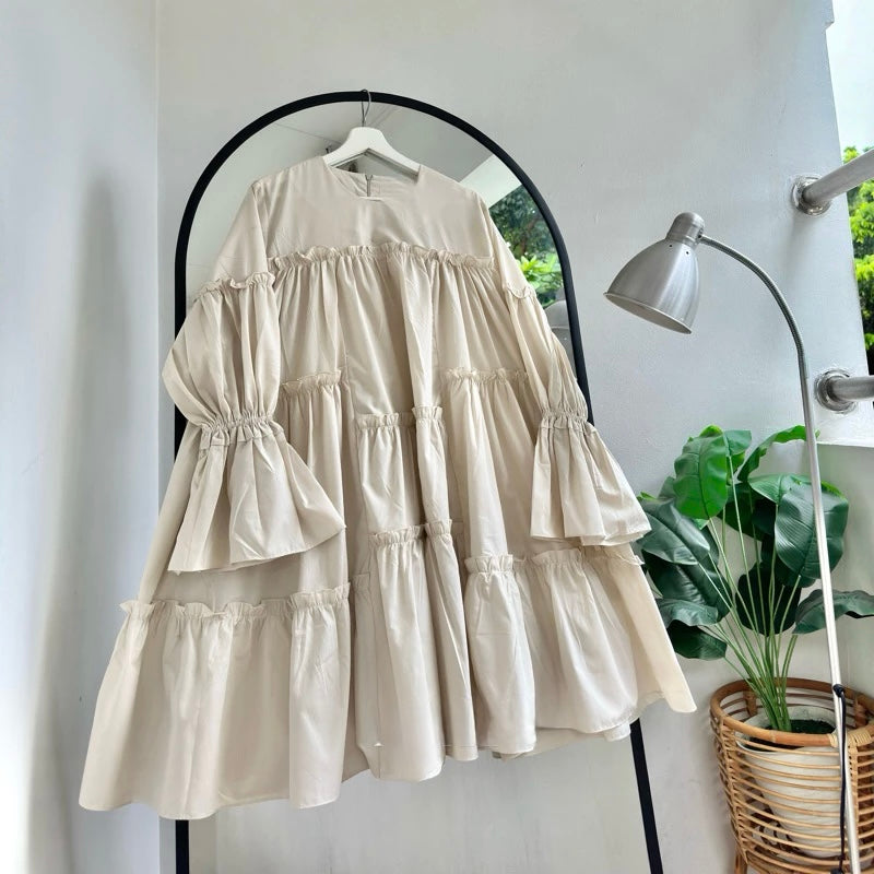 The long balloon sleeves are gently gathered at the wrists, adding a touch of sophistication to the relaxed fit. Finished with a simple round neckline, it’s a versatile piece that can be styled for casual outings or elevated for special occasions.